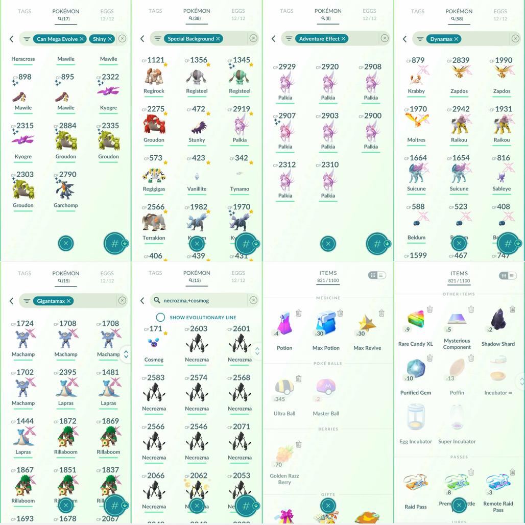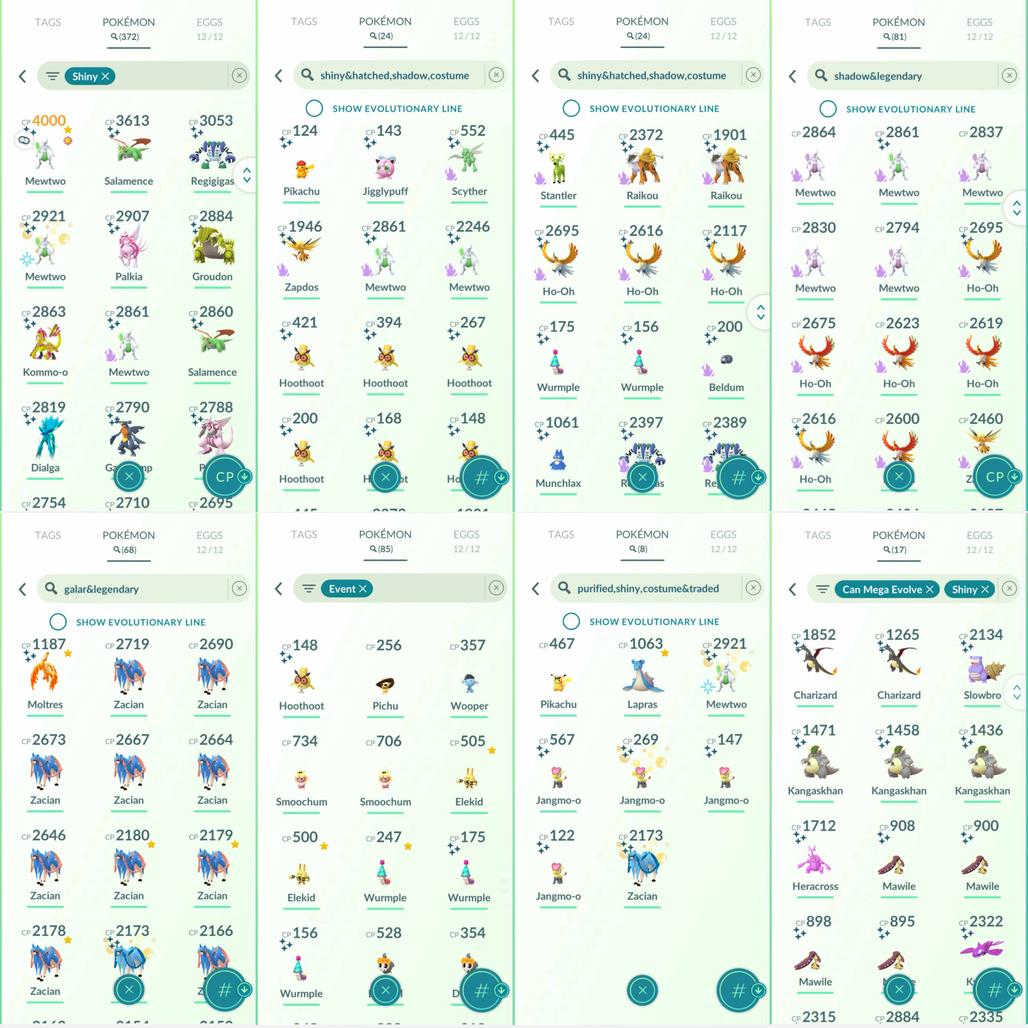 Shiny: shadow beldum, munchlax, party hat wurmple, Pikachu Rei's Cap, shadow zapdos, Mewtwo, shadow raikou, Lugia, shadow ho-oh, regirock, regice, mesprit, dialga origin, palkia, shadow regigigas, giratina, darkrai, cobalion, terrakion, tornadus, reshiram, genesect, yveltal, kartana, guzzlord, zacian an, garchomp.