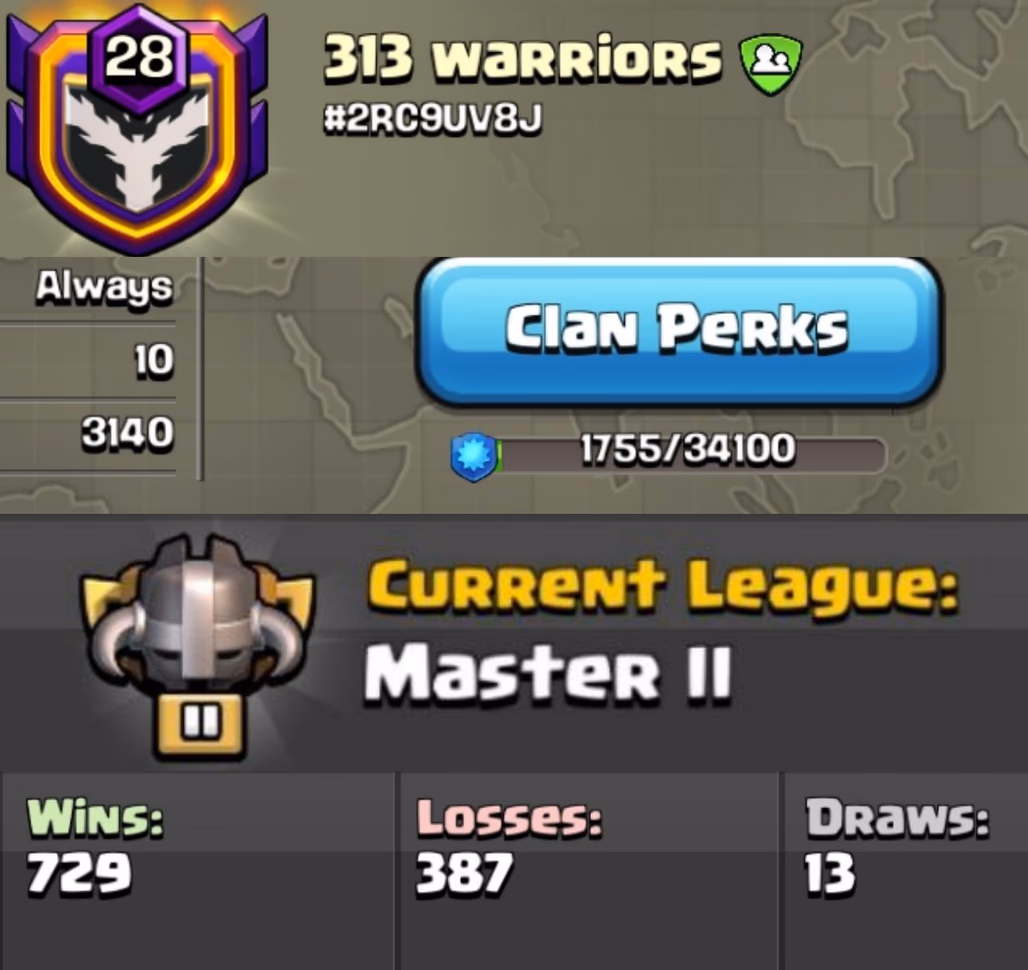 729 win 💎 NAME: 313 warriors 💎 LEVEL: 28- CAPITAL HALL: 10 - WAR LOG: 729-387 -CWL League : Master II - INSTANT