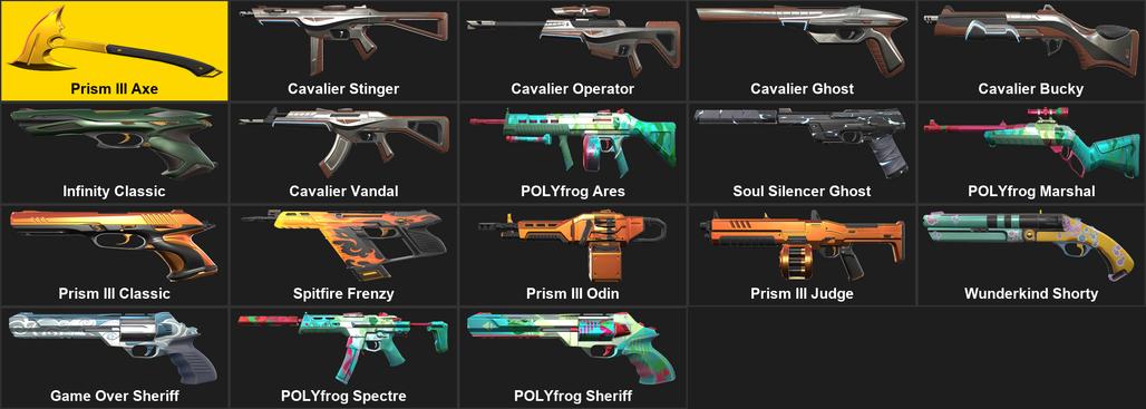 Prism III Axe, Cavalier Stinger, Cavalier Operator, Cavalier Ghost, Cavalier Bucky, Infinity Classic, Cavalier Vandal, POLYfrog Ares, Soul Silencer Ghost, POLYfrog Marshal, Prism III Classic, Spitfire Frenzy, Prism III Odin, Prism III Judge, Wunderkind Shorty, Game Over Sheriff, POLYfrog Spectre, POLYfrog Sheriff
