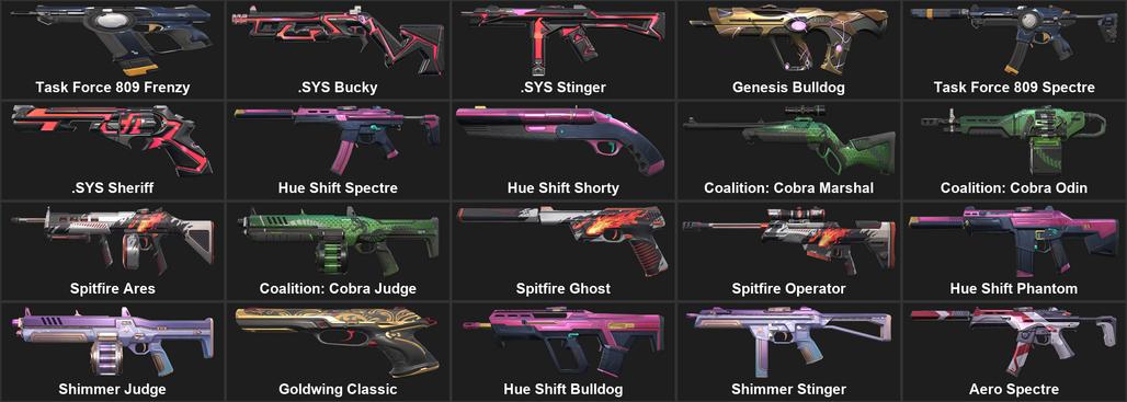 Task Force 809 Frenzy, .SYS Bucky, .SYS Stinger, Genesis Bulldog, Task Force 809 Spectre, .SYS Sheriff, Hue Shift Spectre, Hue Shift Shorty, Coalition: Cobra Marshal, Coalition: Cobra Odin, Spitfire Ares, Coalition: Cobra Judge, Spitfire Ghost, Spitfire Operator, Hue Shift Phantom, Shimmer Judge, Goldwing Classic, Hue Shift Bulldog, Shimmer Stinger, Aero Spectre