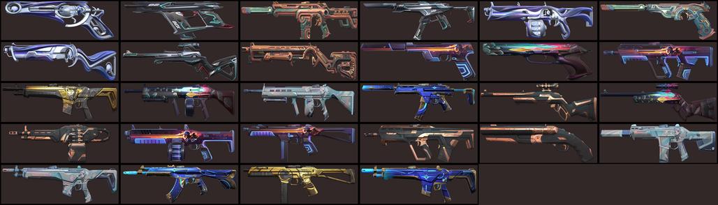 Iridian Thorn Sheriff, Venturi Frenzy, Piedra del Sol Phantom, Venturi Spectre, Iridian Thorn Judge, Piedra del Sol Ghost, Iridian Thorn Bucky, Venturi Marshal, Piedra del Sol Bucky, Gridcrash Ghost, Premiere Collision Classic, Gridcrash Bulldog, Immortalized Guardian, Premiere Collision Ares, 9 Lives Ares, Starlit Odyssey Spectre, Rune Stone Marshal, Premiere Collision Marshal, Rune Stone Odin, Gridcrash Judge, Gridcrash Stinger, Rune Stone Bulldog, Rune Stone Shorty, 9 Lives Phantom, 9 Lives Guardian, Starlit Odyssey Vandal, Immortalized Stinger, Starlit Odyssey Guardian