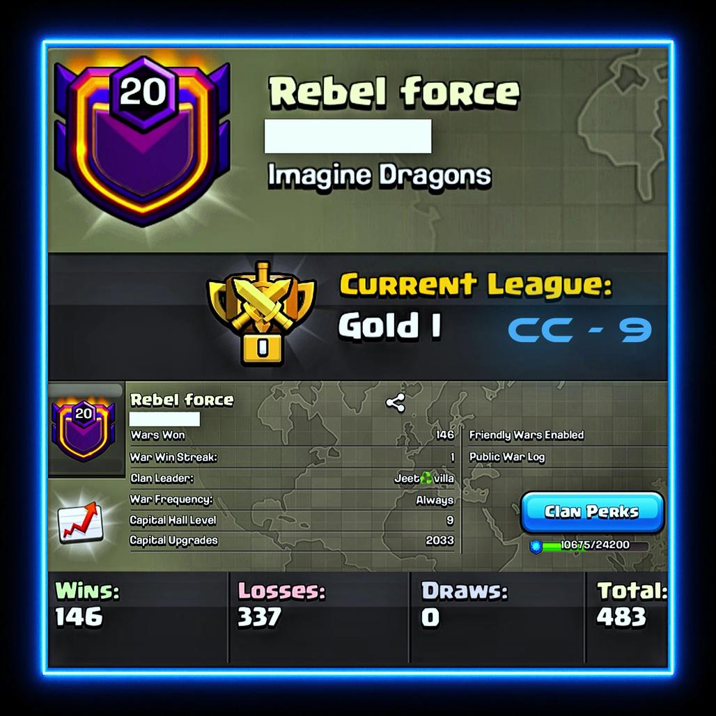 LvL: 20 ! Rebel Force ! Rare Name ! Clan Capital 9 ! Gold 1 ! Warlog: 146 Win 337 Loss ! Perks 10600:24200 ! Best Deal Ever !