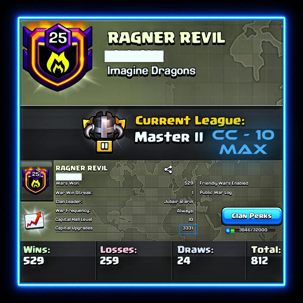 LvL: 25 ! RAGNER REVIL ! Rare Clan ! Master 2 ! Clan Captain Full Max 3331 ! Warlog 529 Win 259 Loss ! Best Deal Ever !