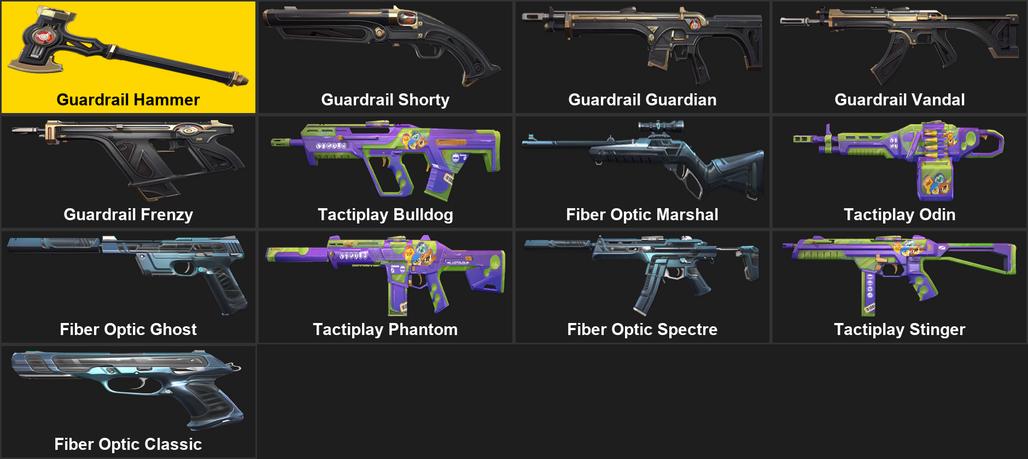Guardrail Hammer, Guardrail Shorty, Guardrail Guardian, Guardrail Vandal, Guardrail Frenzy, Tactiplay Bulldog, Fiber Optic Marshal, Tactiplay Odin, Fiber Optic Ghost, Tactiplay Phantom, Fiber Optic Spectre, Tactiplay Stinger, Fiber Optic Classic