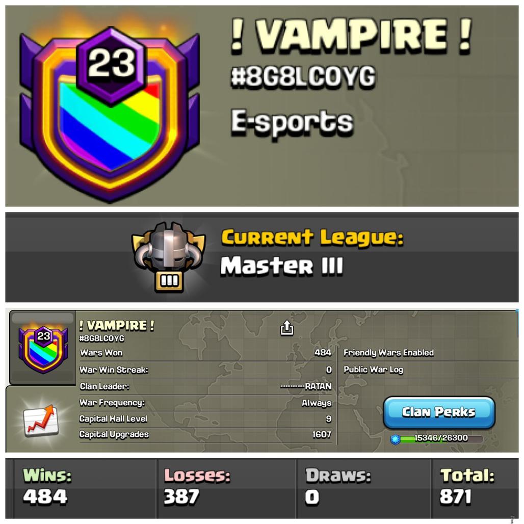 NAME- ! VAMPIRE ! | LVL 23| WARLOG W-L-D:484-387-0 | CWL League: MASTER 3| CC: 9!!
