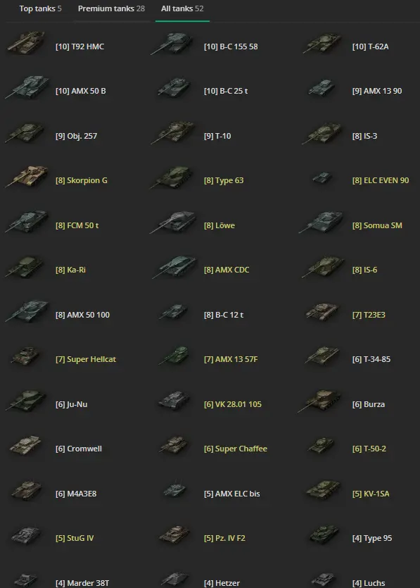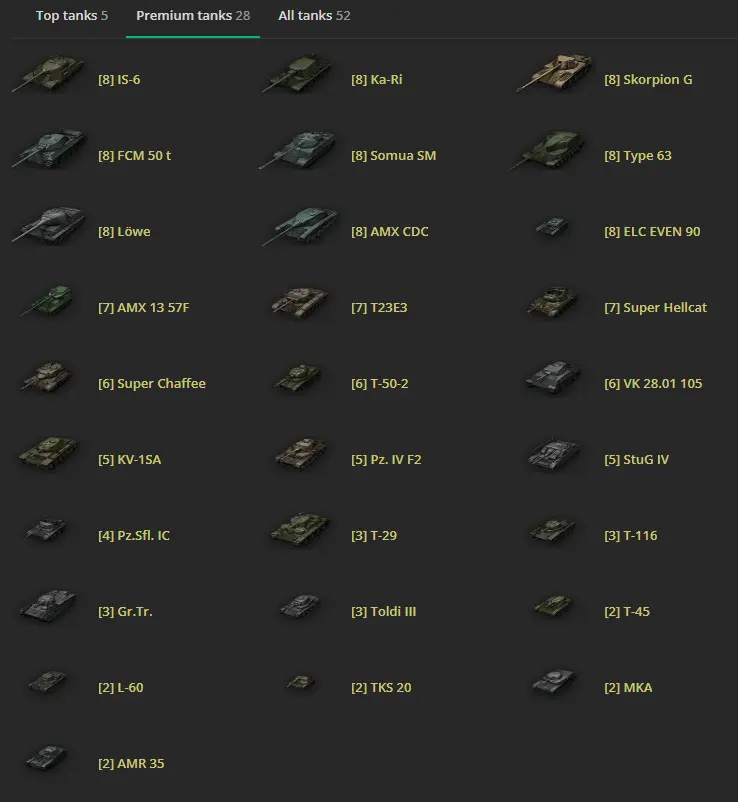 [EU] 5 TIER X | 28 PREMIUM TANK | TOTAL TANKS 52 | 7894 (46%) WINS | 8,924,504 CREDITS | 908 GOLD | SEE DESCRIPTION